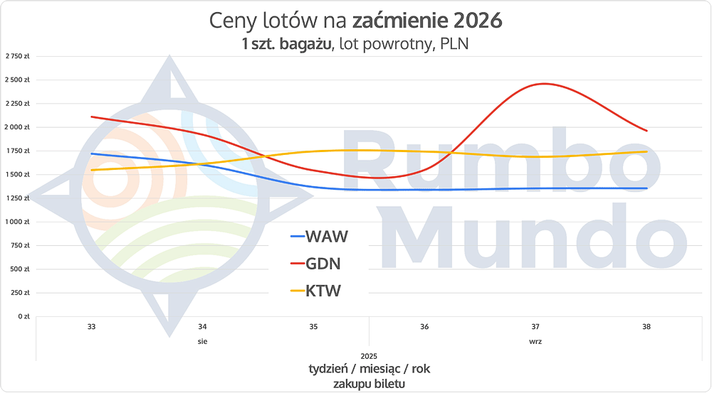 W sierpniu 2025 najtańszym portem wylotowym – dość zaskakująco – były Katowice (badamy ceny lotów z Katowic, Warszawy i Gdańska). Cena przelotu na sierpień ’26 bez bagażu zaczynała się tu już od 848 zł. Jednak loty z Katowic dość szybko zdrożały i we wrześniu 2025 najtańszym przewoźnikiem dla Katowic jest już LOT, oferujący loty z bagażem podręcznym za 1354 zł, a z rejestrowanym za 1688 zł.Najtańszym portem wylotowym we wrześniu ’25 jest Warszawa. Ceny lotów na okolice 12 sierpnia 2026 zaczynają się tu odpowiednio odpowiednio od 1242 zł (bez bagażu), 1354 zł (bagaż podręczny) i również 1354 zł za lot z bagażem podręcznym i rejestrowanym (Lufthansa). Najdroższy (zaskakująco) jest obecnie Gdańsk: 1838 zł za lot bez bagażu i ponad 2000 zł za loty z bagażem.