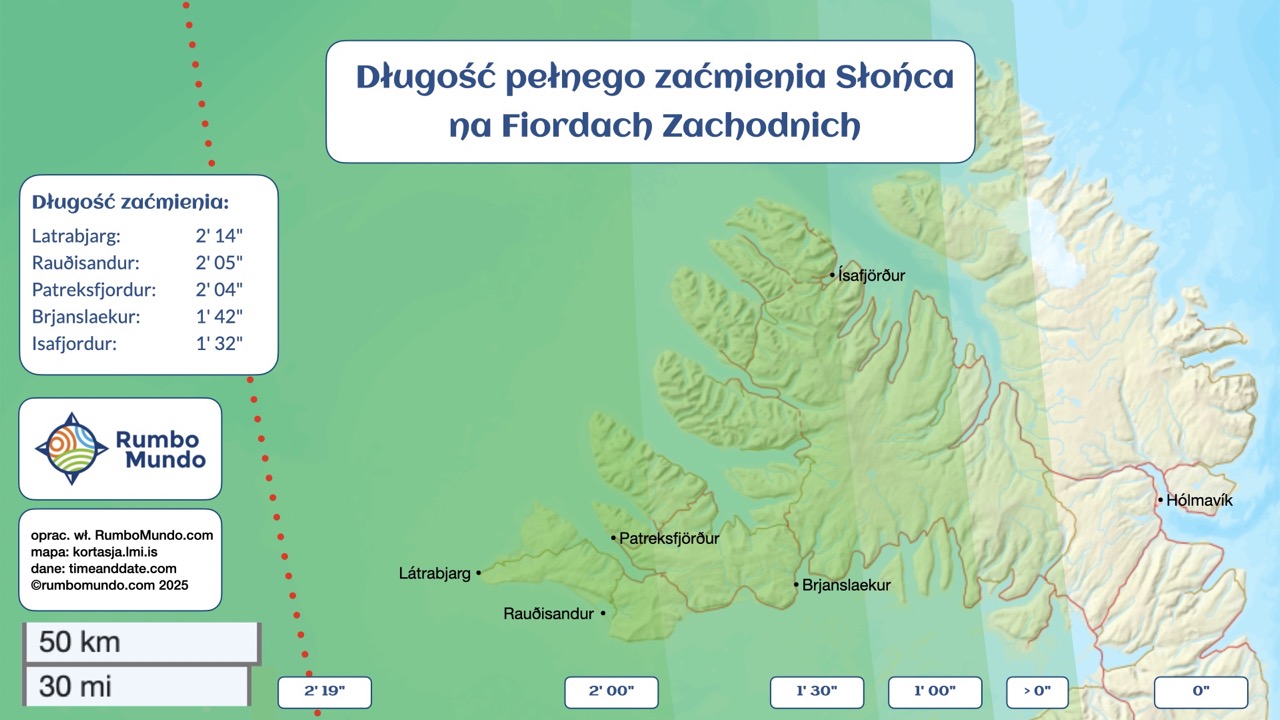 Zaćmienie całkowite będzie też widoczne także w Reykjaviku, na półwyspie Reykjanes i w okolicach lotniska Keflavik, jednak tam zaćmienie całkowite będzie trwało mniej niż 2 minuty (zobacz mapkę poniżej).