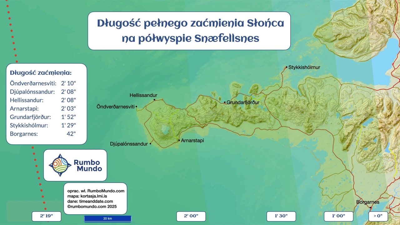 opr. wł.; mapa: kortasja.lmi.is; dane: timeanddate.comObszar zaćmienia o długości ponad 2 minuty będzie tu sięgał (na południowym wybrzeżu półwyspu) prawie aż do (południowego) skrzyżowania drogi 54 i 574, a więc np. wyraźnie na wschód od miejscowości Arnarstapi.