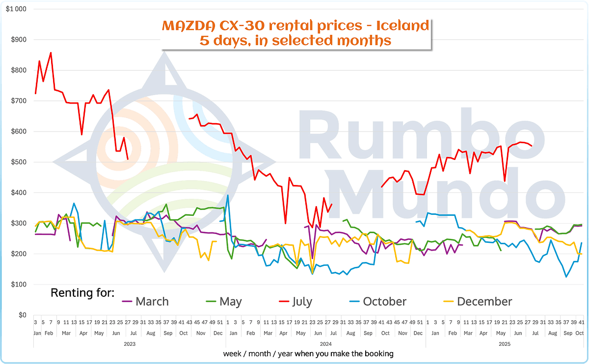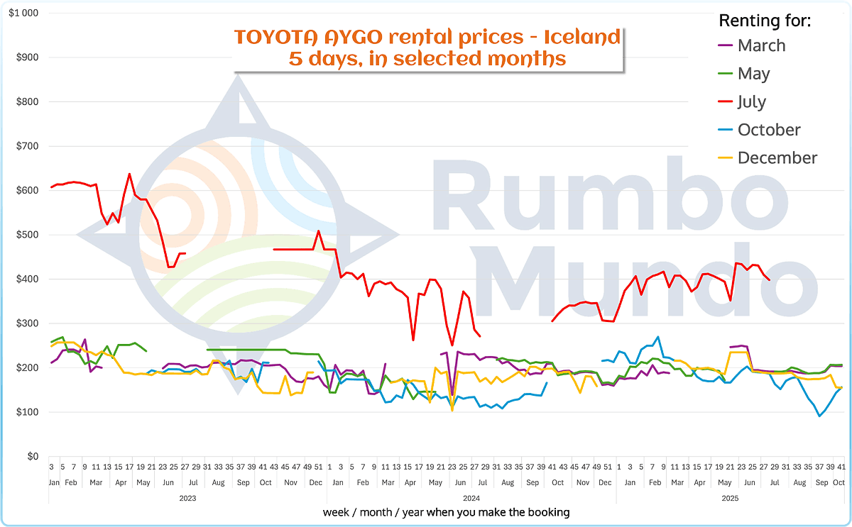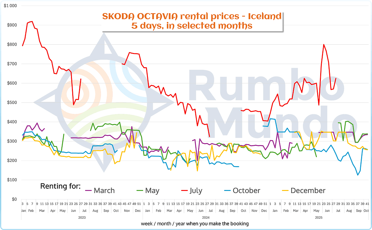 Thecharts show that – especially for July – the moment WHEN you rent your car is also of colossal importance. Prices do change A LOT over time. We write about this in more detail later in the article.