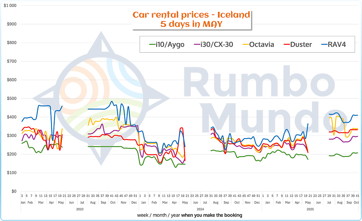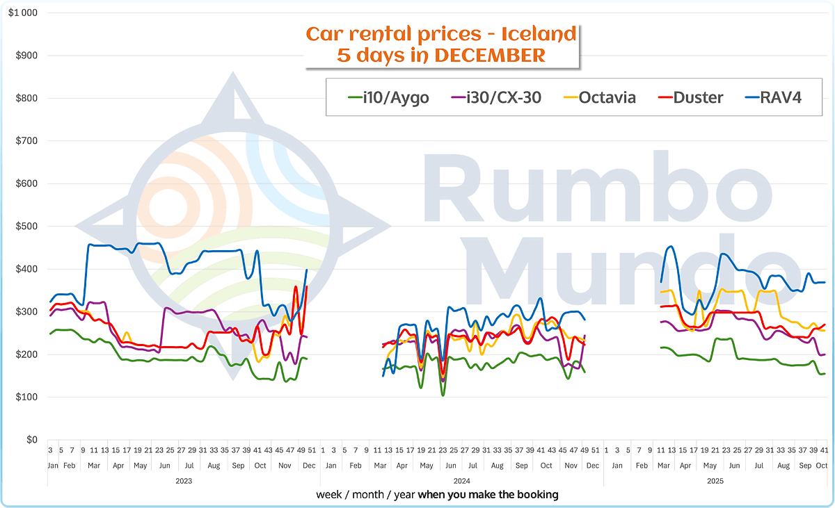 All of this is based on a survey of car rental prices in Iceland, which we have been conducting since the beginning of 2023. Data from these surveys, in the form of charts, are presented below.