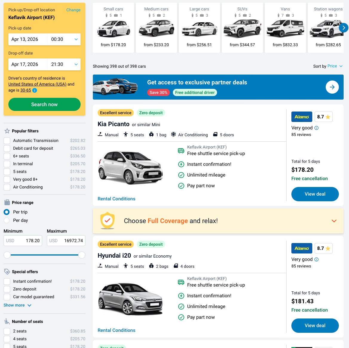 Discover Cars almost always offers the best prices on cars in every category. “Almost”, because on some rare occasions we were able to find even better prices on the site we present below – Reykjavik Cars.